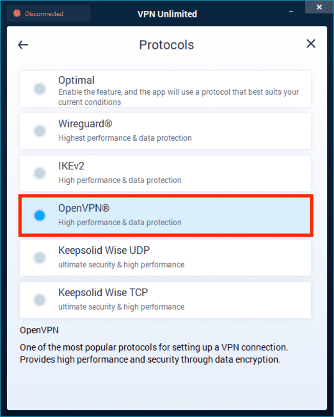 • پروتکل OpenVPN را انتخاب کنید و به صفحه اصلی برگردید.