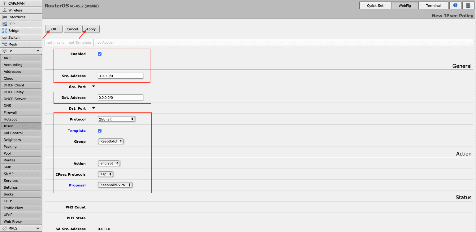 2. Now you need to create an IPsec policy on your Mikrotik router. Go to the Policies tab and click Add New. Fill out the fields as shown below and click OK