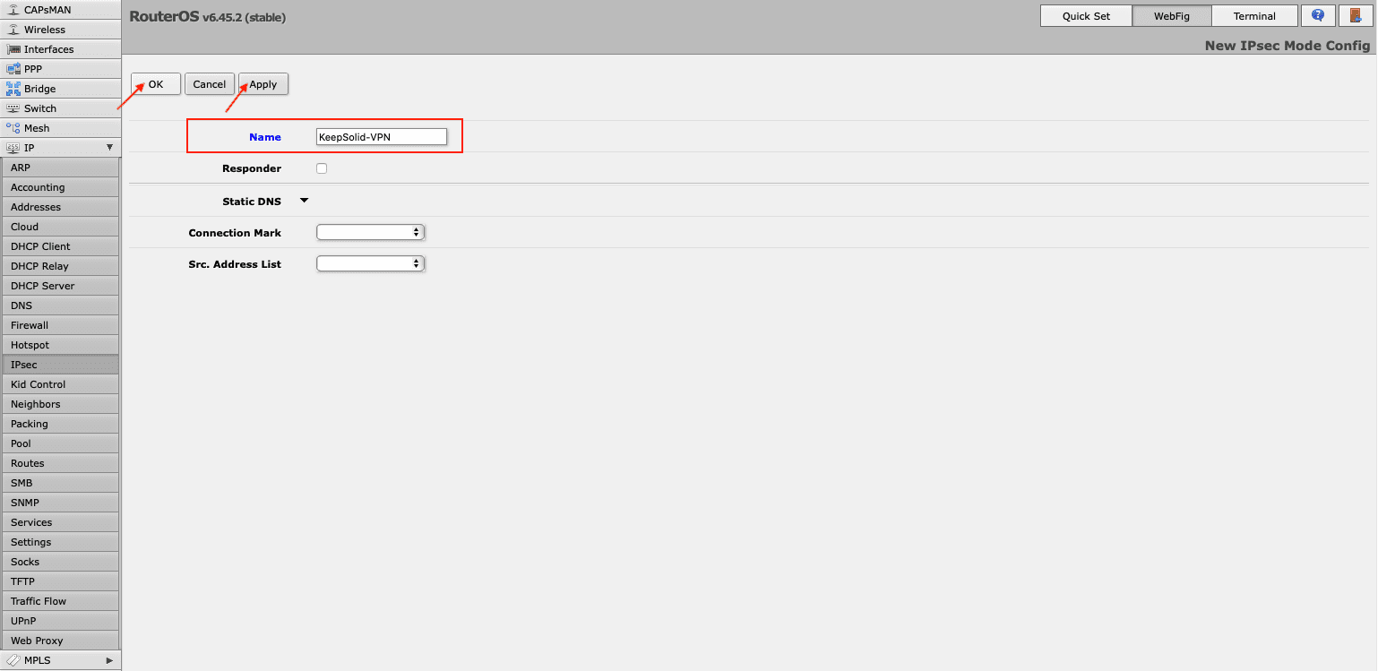 1. Proceed to the Mode Configs tab in the same IPsec section and press Add New. Enter the name of the configuration and click Apply > OK.