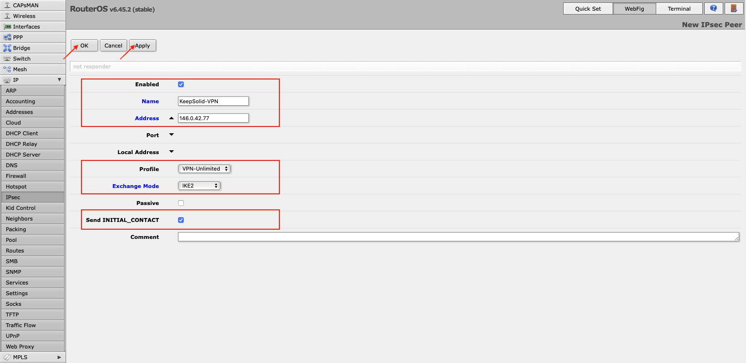 • Peer: Select the peer you’ve added, e.g. KeepSolid-VPN
