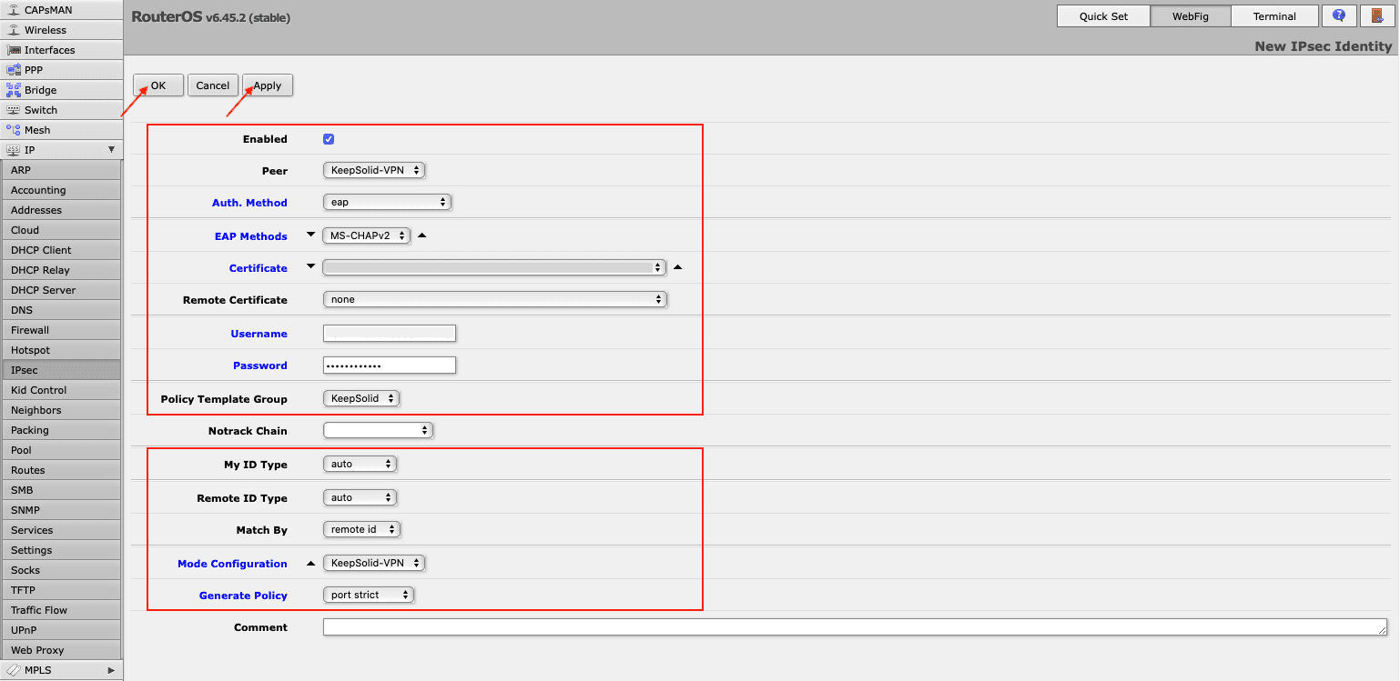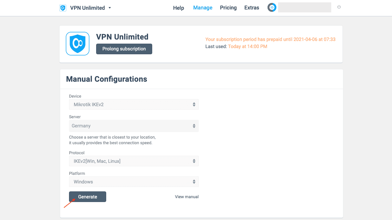 Before setting up VPN on Mikrotik router, you need to generate IKEv2 configurations in your KeepSolid User Office