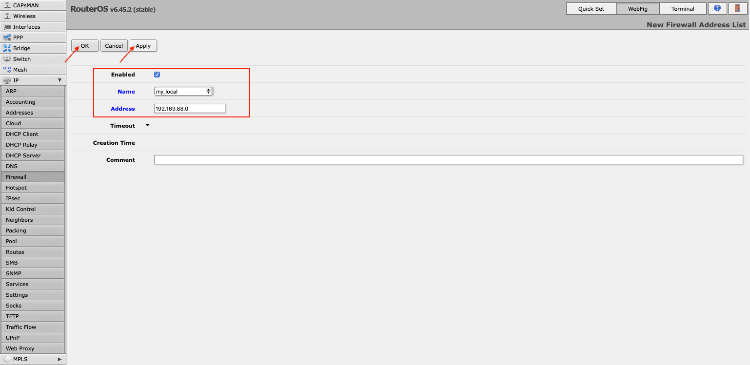 To send all traffic to the tunnel, you need to create address list with your local network. For this, navigate to Firewall > Address Lists and click Add New. In the Name field, choose your local network and type in its IP address and network prefix length in the Address field.
