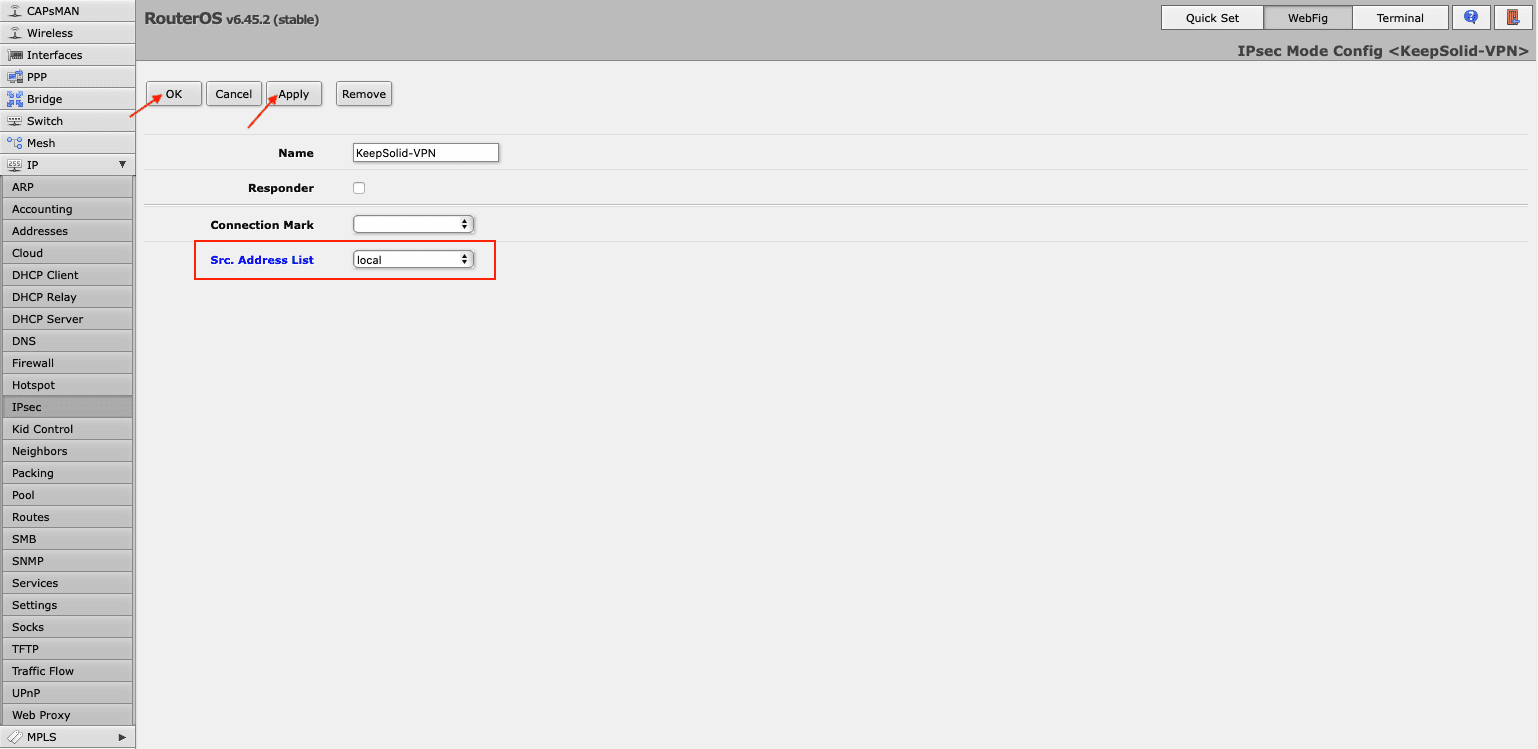 1. Now you need to assign this list to your mode configuration. For this, go to IPsec > Mode Configs > KeepSolid-VPN, and select the list you’ve just created in the drop down menu in front of Src. Address List field.