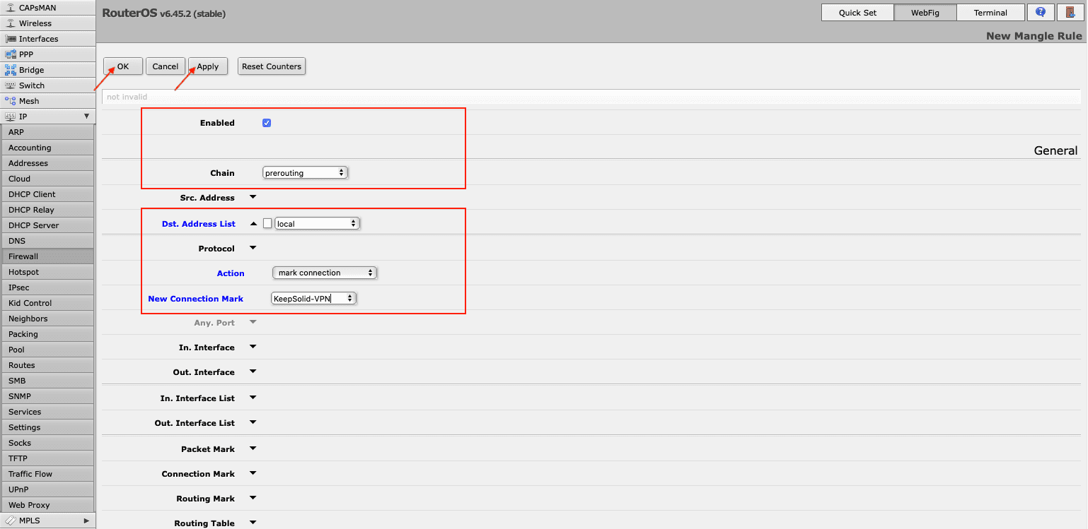1.  Go to Firewall > Mangle to create mangle rule. Press Add New and make the following changes: