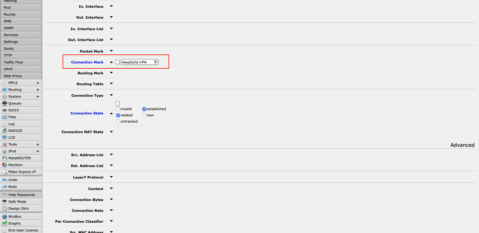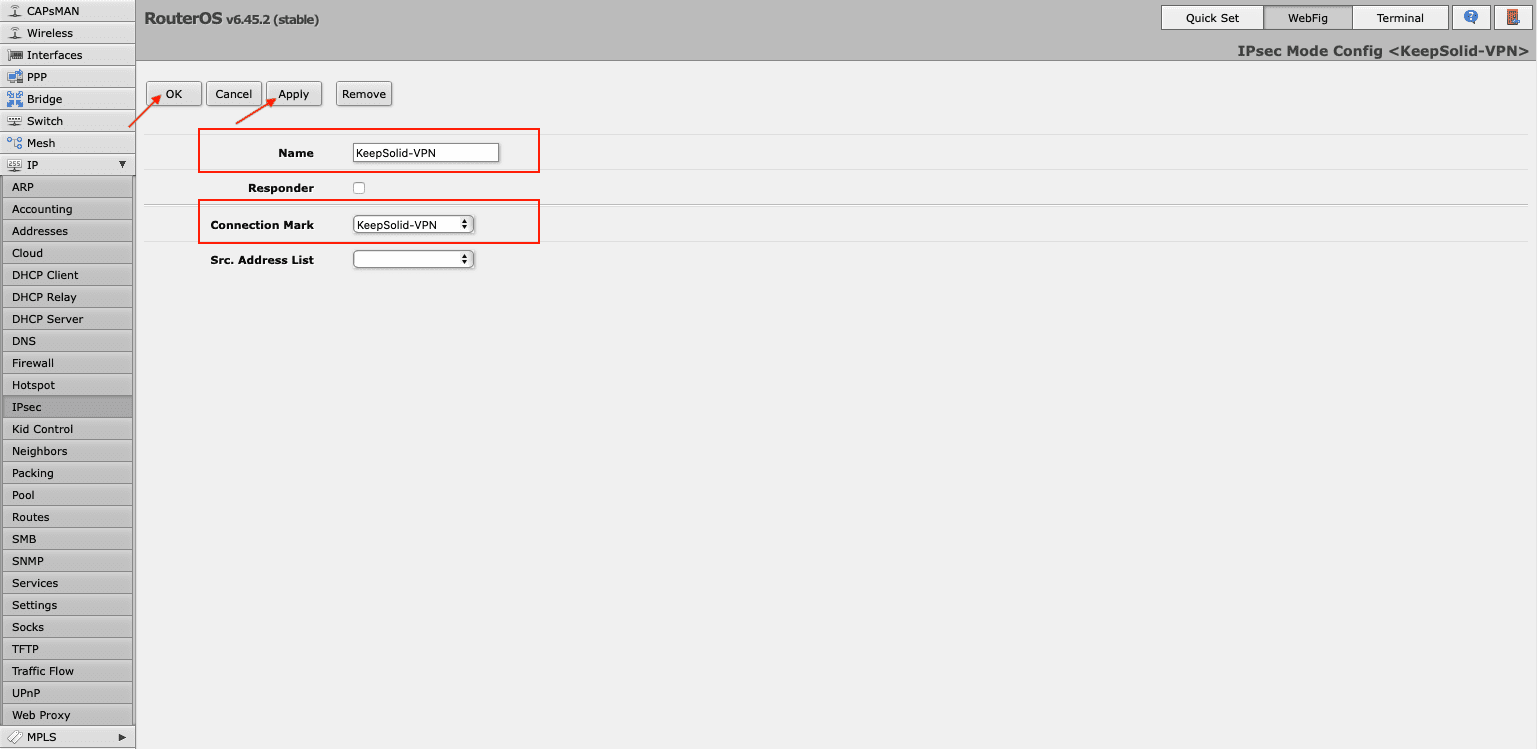 1. Create connection-mark via IPsec > Mode Configs > Add/Edit.
