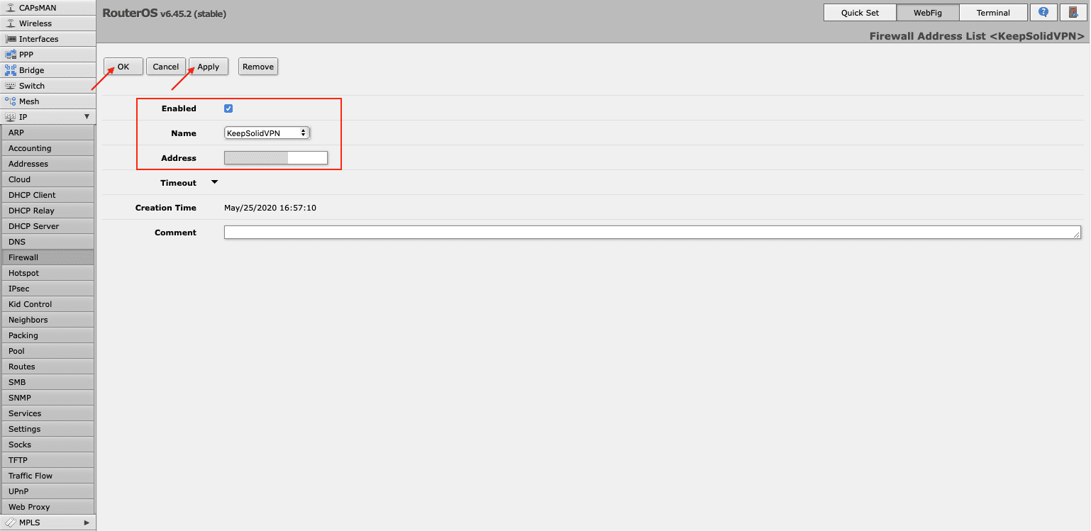 • Address: Enter the IP address of the chosen VPN server (you can find it in the IPS field of the settings you’ve generated)