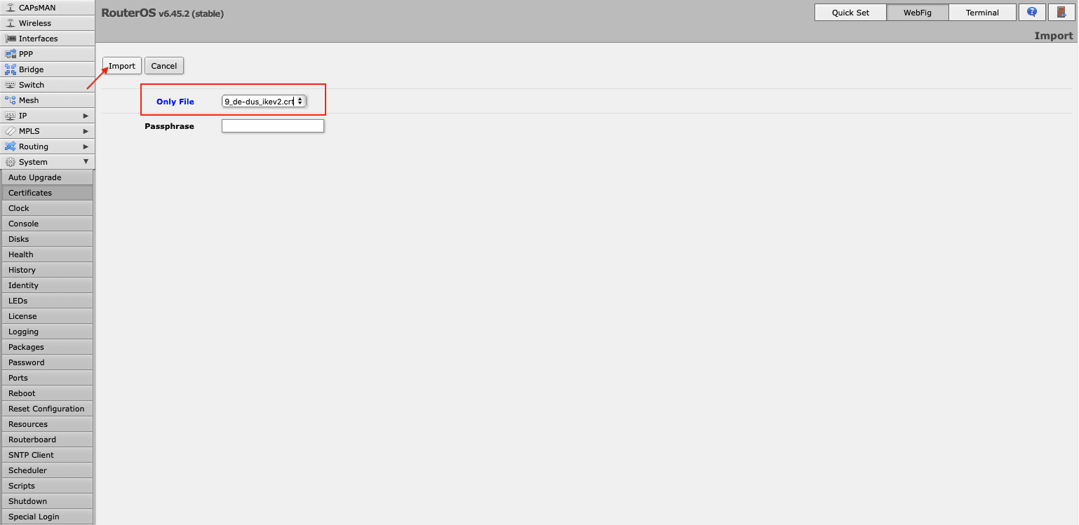 1. Import your certificate via System > Certificates > Import. In the drop down menu opposite the Only File field choose the certificate you’ve just added, and click Import.