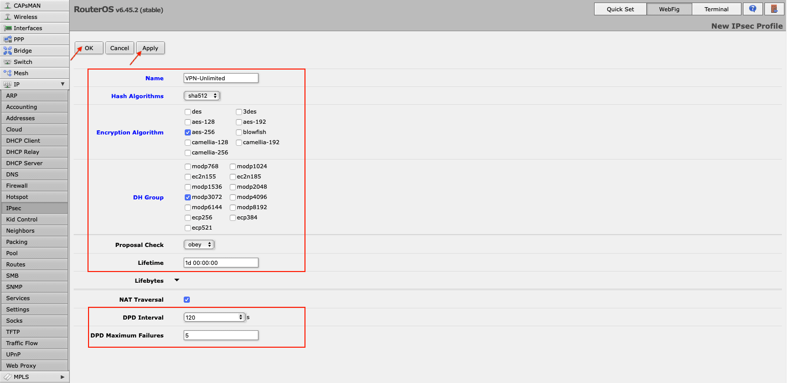 1. Add a new profile on your Mikrotik router by navigating to IP > IPsec > Profiles > Add New. Fill out the fields of your new profile in the following way: