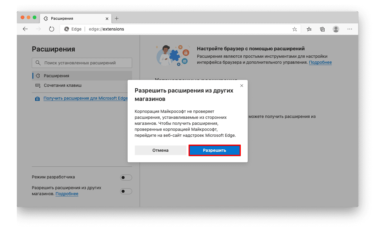 3. Включите опцию Разрешить расширения из других магазинов.