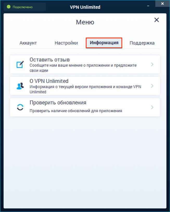 - Проверить обновления: посмотрите установлена ли у вас актуальная версия приложения и в случае необходимости обновите ваш Windows VPN клиент.